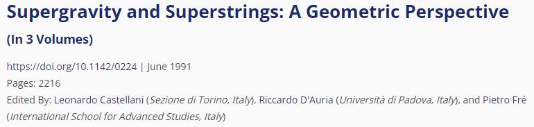 This three-volume book was conceived in the late 1980.s years as a unified presentation of supergravity and superstring theories based on the rheonomic approach to supersymmetric theories that had been invented by D'Auria & Fré in the years 1979-1980 on the basis of ideas originally put forward by Ne'eman and Regge and then was consistently developed and applied to all existing examples of supergravities by Castellani, D'Auria and Fré in the course of the following few years. Furthermore this rather monumental work aimed at reviewing also Kaluza Klein Supergravity with its corresponding mass-spectra providing at the same time all the mathematical foundations of Homogeneous Space Geometry and Harmonic Analysis.
